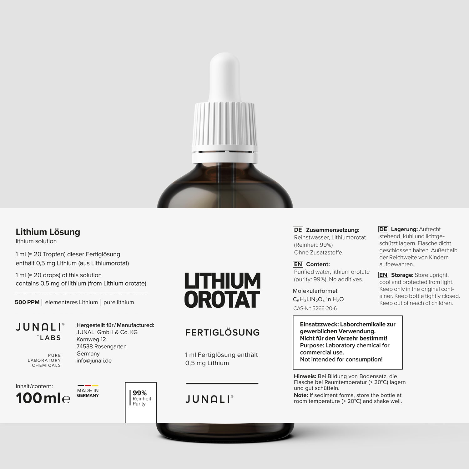 Lithium Fertiglösung in premium Qualität von JUNALI LABS: Unsere wässrige Lösung besteht aus hochreinem Lithium (Lithium Orotat) mit mindestens 98,5% Reinheit und Reinstwasser. Ohne Zusatzstoffe. Unser hoher Qualitätsstandard wird regelmäßig von unabhängigen Laboren geprüft. Die Lösung besteht aus Reinstwasser und reinem Lithiumorotat.