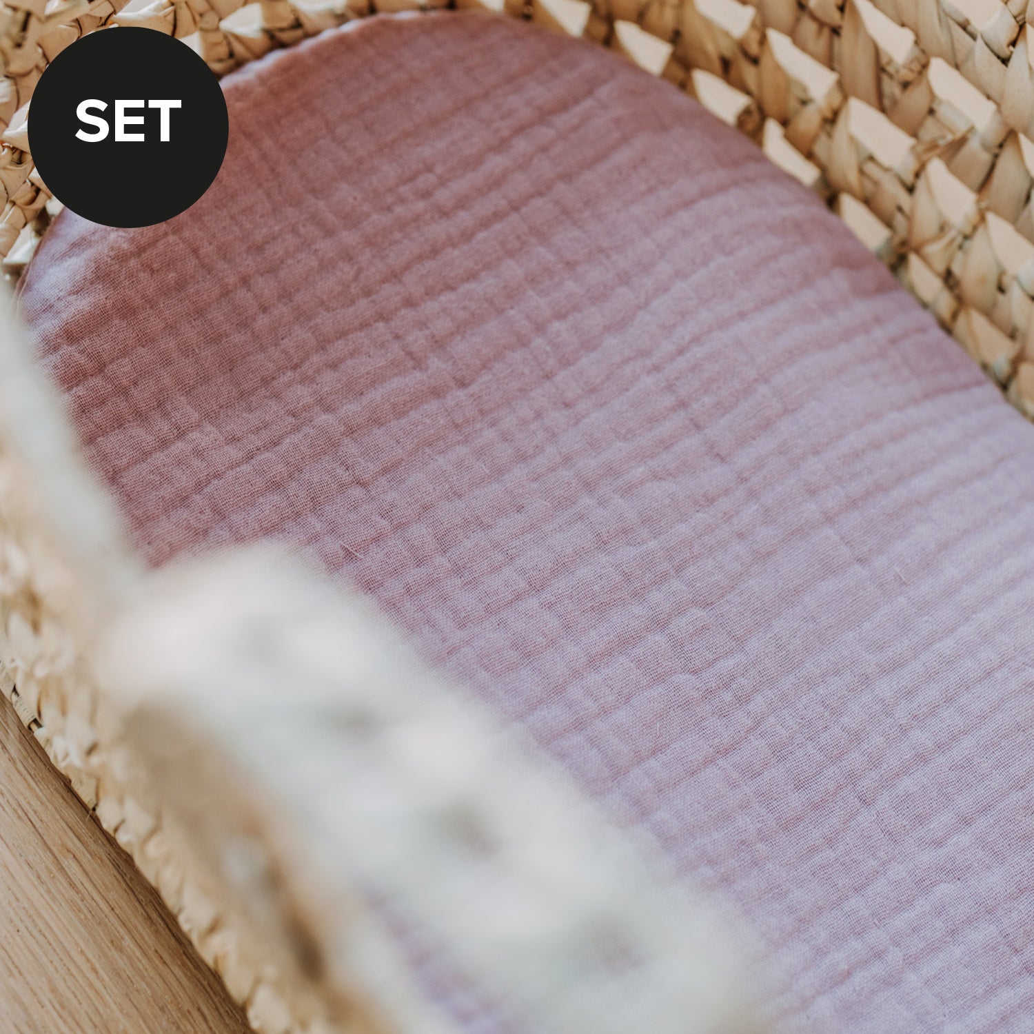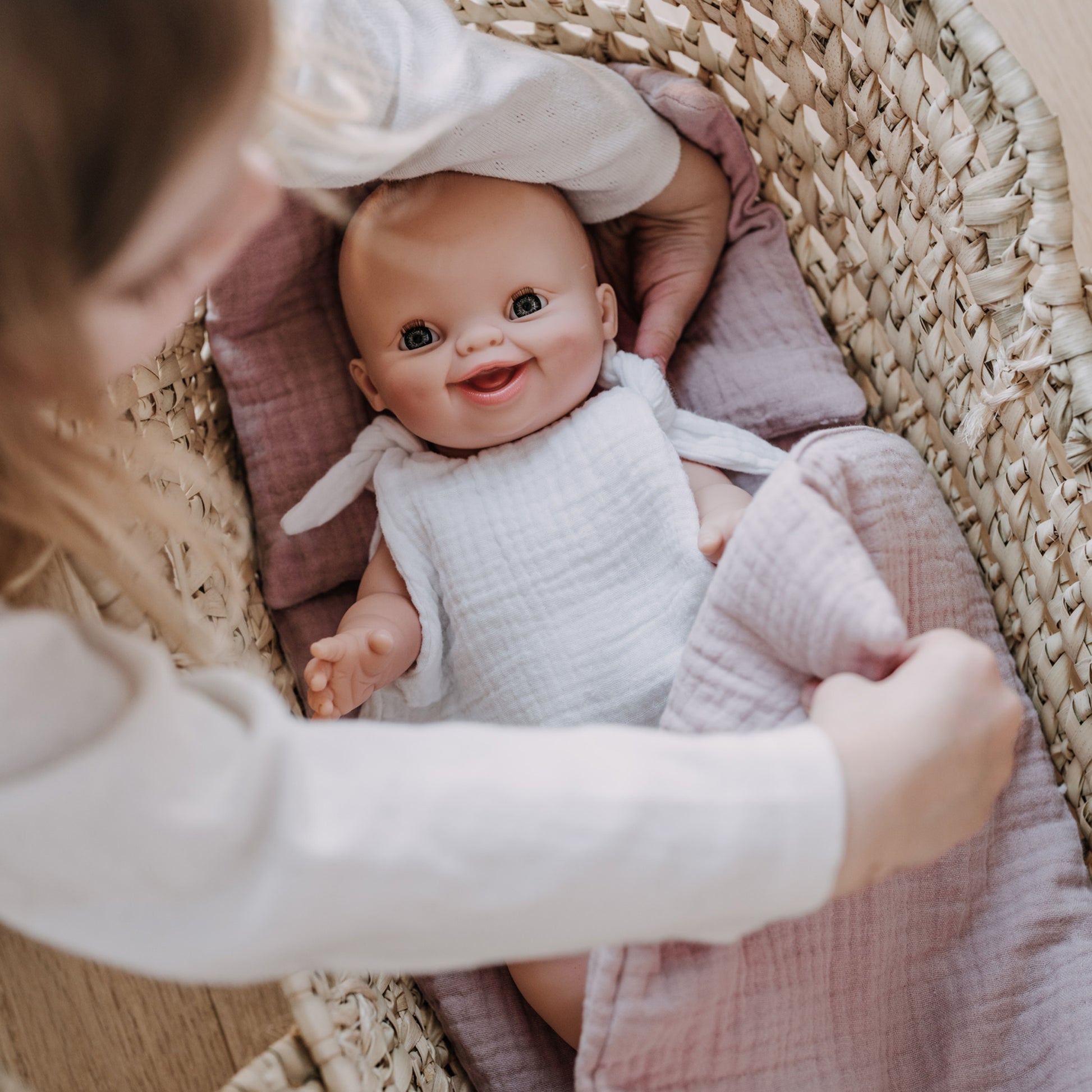 Bestehend aus der Puppentrage aus Palmblatt und der Matratze Pudertraum rosa.